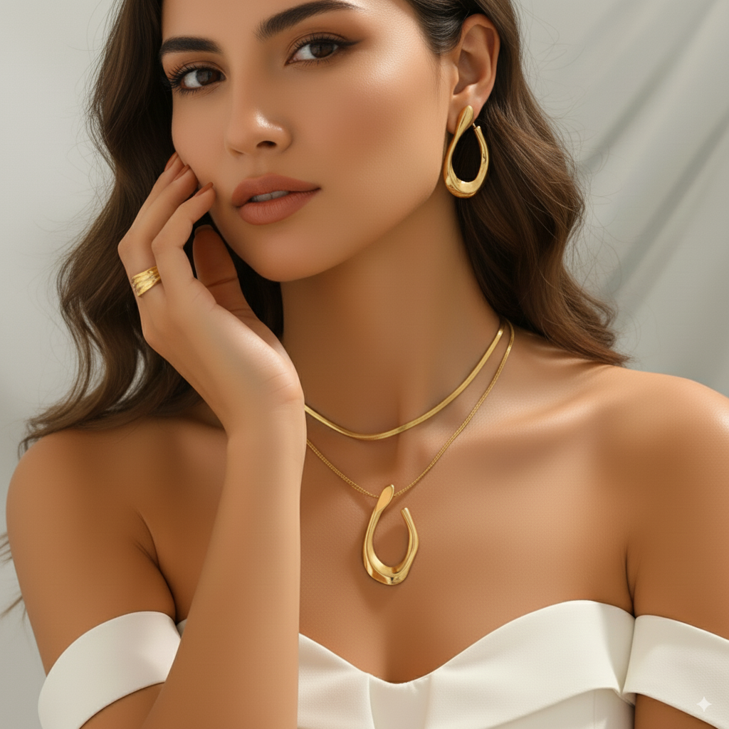 This set of stainless steel gold plated jewelry includes a necklace, earrings, and ring. With its beautiful design and durable materials, it is the perfect addition to any outfit. Elevate your style and make a statement with this elegant and versatile hook set.