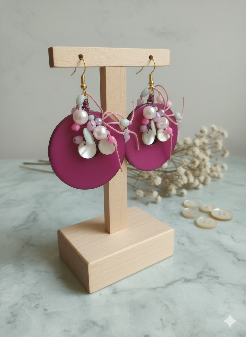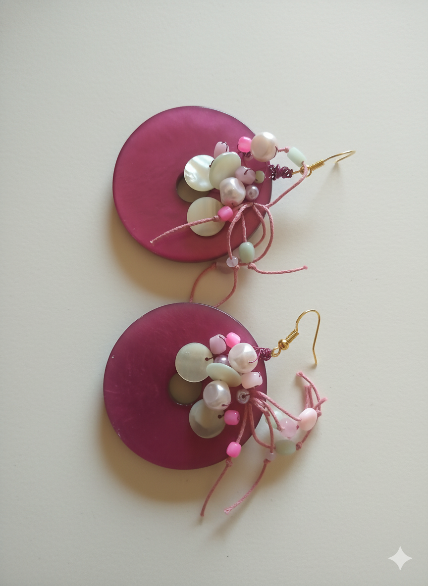 Get ready for the party with our Confetti Girls Earrings! These vibrant, handcrafted drops feature large magenta discs topped with a playful burst of color. Each pair is adorned with intricate clusters of freshwater pearls, delicate glass beads in pastel mint and pink, and shimmering mother-of-pearl accents, giving you a beautiful, artistic look that is ready to celebrate.